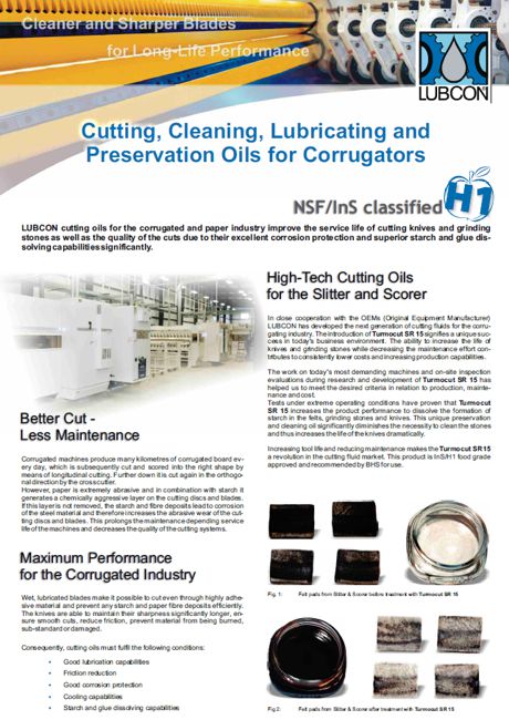 높은 생산 속도에서 슬리터/스코어러 및 커팅 디스크를 정밀하게 배치하고 신속하게 배치하는 것이 최우선 과제입니다. 그러나 종이는 극도로 마모성이며 전분과 함께 절단 디스크 및 블레이드에 화학적으로 유해한 층을 생성합니다. 전분 및 섬유 침전물 층이 제거되지 않으면 평탄하지 않은 절단으로 이어진다. 이로 인해 블레이드를 조기에 교체하고 유지 보수 관련 긴 작동 시간을 오래 걸리게됩니다. 오일 공급 블레이드 (Turmocut SR15와 같은 절삭유 포함)는 높은 점착력을 가진 재료를 통해 절단 할 수 있으며 전분 및 종이 섬유 침전물을 효과적으로 방지합니다. 칼은 날카로움을 월등하게 오래 유지하여 부드러운 절단, 마찰 감소, 재료의 연소 및 손상을 방지합니다. 루브콘(LUBCON)의 마모 및 부식 방지 윤활제는 특히 골판지 산업에서의 슬리터 스코어러 요구에 특화되어 낮은 윤활유 소비와 높은 신뢰성을 보장합니다.