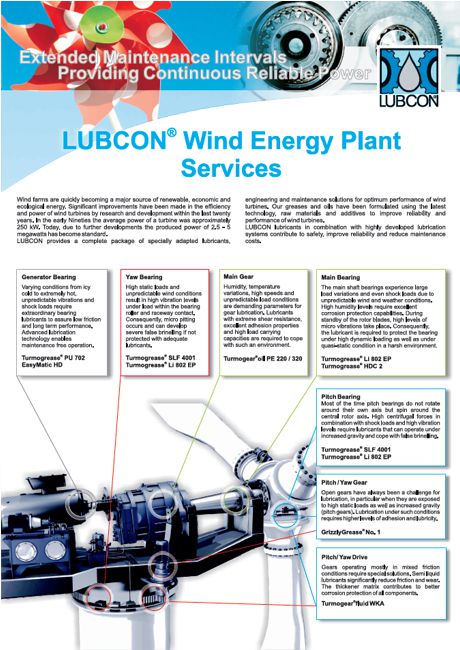 재생 가능 에너지가 점점 더 중요시되고 있습니다. 특히 깨끗한 풍력 발전은 점점 더 많은 세계적인 인기를 얻고 있습니다. 지난 몇 년 동안, 효율적인 구동 및 베어링 기술의 사용은 풍력 터빈의 정격 출력뿐만 아니라 풍력 에너지에 대한 전반적인 수요를 증가 시켰습니다. 현대식 풍력 터빈은 2.5 ~ 5 메가 와트의 전력을 생산할 수 있으므로 수천 가구에 환경 친화적인 에너지를 공급할 수 있습니다. 로터 베어링, 메인 베어링, 피치 및 요 드라이브와 같은 고정밀 부품은 매일 환경 영향뿐만 아니라 높은 부하에 노출되어 있습니다. 효율적인 윤활유를 통해 이러한 조건에서도 설비를 보호해야합니다. 루브콘(LUBCON) 제품은 특별히 풍력 터빈 요건을 충족 시키도록 맞춤 제작되었습니다. 윤활유 소비가 적기 때문에 유지 보수 간격을 연장하고 최대 효율을 제공하며 운영 비용을 절감합니다.